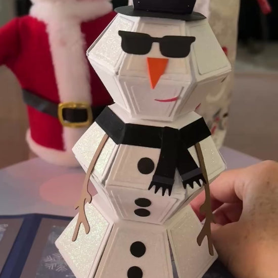 Meet your new favorite greeting card—a playful pop-up featuring a cool three-tiered snowman decked out in sparkly white glitter and the ultimate accessory: sunglasses! Watch as the card opens and your frosty friend springs to life in all his glory. Flip the switch and watch him glow with a fun, magical light that'll make anyone smile. With an easy-to-replace battery, this charming creation sticks around as a delightful reminder of your thoughtfulness. Perfect for spreading joy and creating those unforgettable "wow" moments.