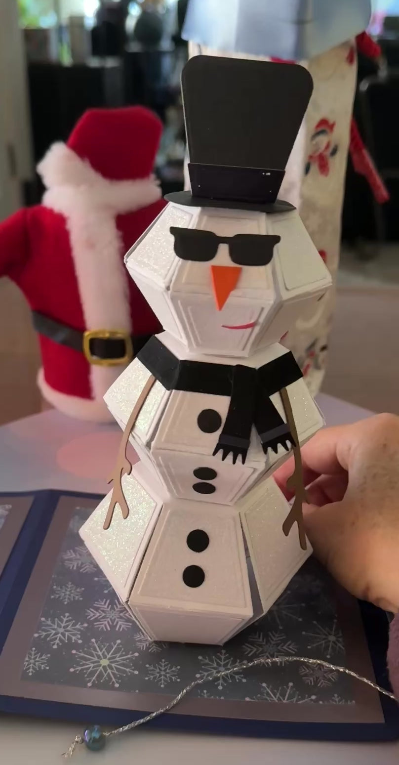 This refined pop-up greeting card showcases a dapper three-tiered snowman rendered in shimmering white glitter cardstock, accessorized with trendy sunglasses. As recipients open the card, the snowman springs forth with dynamic movement, delivering an engaging tactile experience that delights. An integrated light feature—easily activated by the recipient—adds an enchanting luminous glow to the presentation, transforming the card into an interactive keepsake. The replaceable battery ensures this sophisticated greeting remains functional and cherished for years to come. Ideal for discerning gift-givers seeking distinctive, imaginative cards that transcend ordinary greetings and create memorable moments.